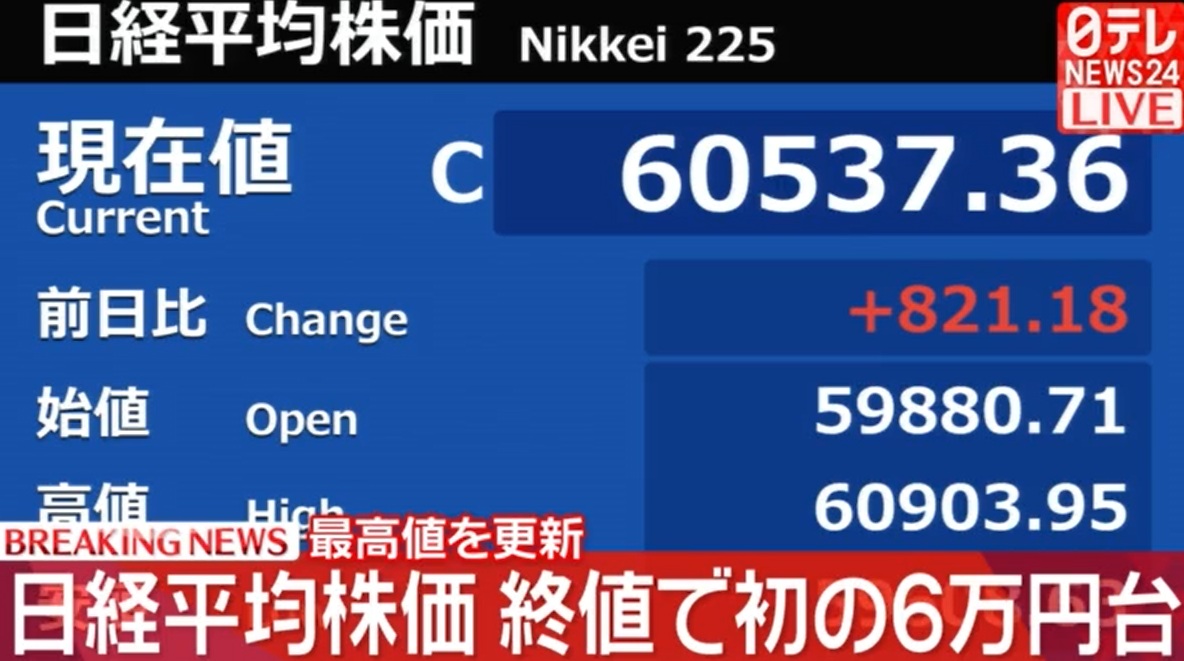 27日,东京股市日经平均股价收盘首次突破6万日元大关,创下历史新高。收盘价较上周末上涨821.18日元,报60,537.36日元。