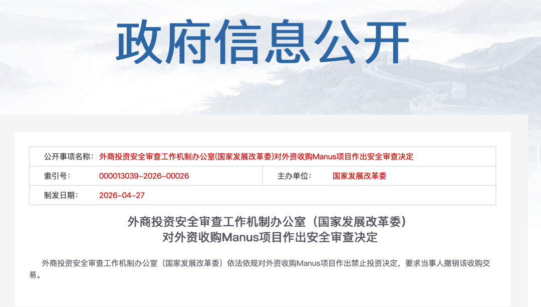 AI摘要:4月27日,国家发展改革委官网发布消息称,外商投资安全审查工作机制办公室(设在国家发展改革委)依法依规对外资收购Manus项目作出禁止投资决定,要求当事人撤销该收购交易。2025年12月29日,Meta宣布将Manus纳入旗下,其AI Agent技术将应用于Meta产品体系。这一机制在2021年1月正式实施的《外商投资安全审查办法》(以下简称《办法》)中被明确规定。
