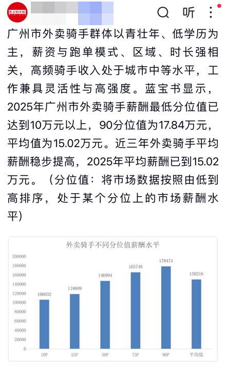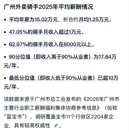 权威机构发布说,广州外卖骑手平均年薪15万,90%+骑手年收入超过10万元……