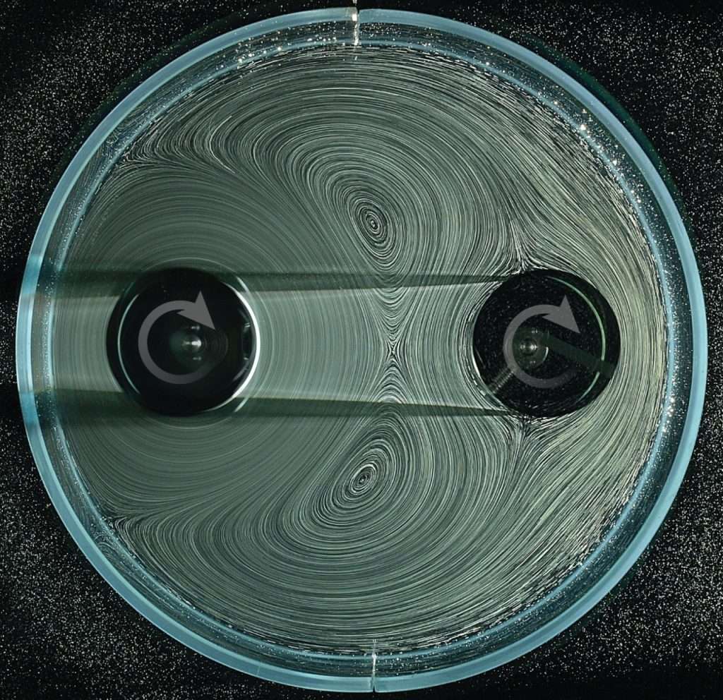研究团队利用浸没在甘油和水混合液体中的圆柱体转子进行实验。通过调节流体的密度等特性,他们能够控制流体的行为。在流体齿轮实验装置中,研究人员设置了两个圆柱体,一个圆柱体被驱动旋转,而另一个圆柱体最开始保持静止。研究人员预测,旋转圆柱体的运动会驱动流体流动,从而驱动静止圆柱体旋转。为了观察这些流动,他们在液体中引入了微小气泡,以便观察流体如何传递运动。实验在不同的圆柱体间距和不同的旋转速度下进行。研究人员发现,在特定条件下,流体中的圆柱体能与另一个圆柱体向着同一方向旋转;在另一些条件下,它可以朝相反方向旋转。