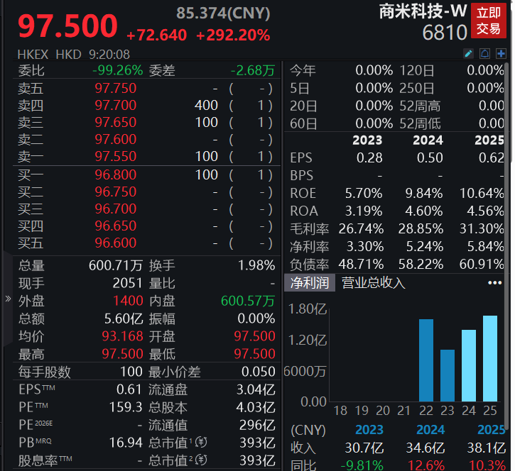 4月29日,“AI商业物联网第一股”商米科技港股上市首日高开超290%,总市值393亿港元。昨日暗盘交易表现强劲,一度涨超342%。