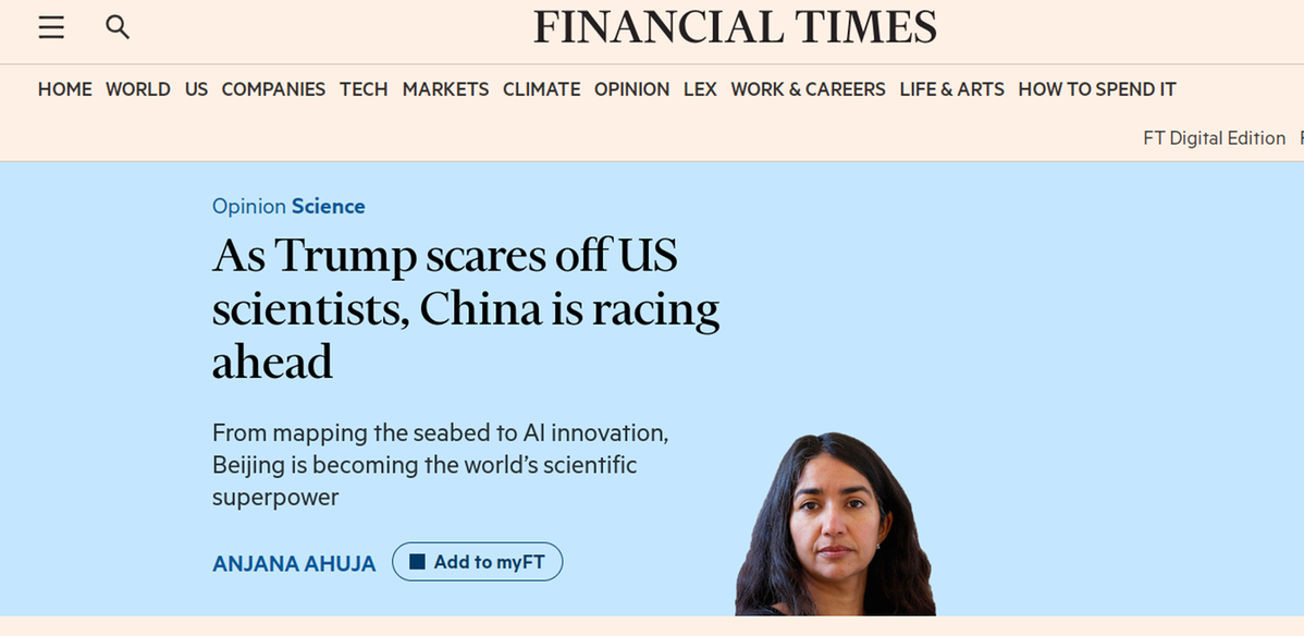中国日报网4月30日电 对基础研究的持续高水平投入,以及对科学人才的重视,都是提升一个国家创新能力的关键。中国近年来在基础科学和教育领域持续加大投入,展现出对长期科研稳定性的高度重视,取得了显著成就。 英国《金融时报》近日刊发的专栏文章指出,通过长期稳定的政策支持,中国科研正加速前进,持续推动基础研究能力快速提升,从海底测绘到人工智能创新,中国正成为全球科技领域的领军者。 文章认为,中国对基础科研的重视,体现了决策层将科技创新视为国家长期竞争力的核心认知。 文章援引伦敦国王学院刘氏中国研究院主任凯瑞·布朗教授在《自然》杂志发表的评论指出,中国的研发支出在2007年至2023年间增长了六倍,总量已超过欧盟。根据经合组织(OECD)的数据,2024年中国研发支出为1.03万亿美元,超过了美国的1.01万亿美元。 布朗表示,2020年中国培养了360万名STEM(科学、技术、工程、数学)专业的毕业生,美国则不到100万。与此同时,中国知名大学的世界排名也迅速攀升。 学术界认为,中国凭借庞大的人才储备及完善的工业体系,正稳步填补全球科技领导力的空白。 反观美国,本届美国政府就职以来,不断削减科研预算,逼迫科学家离开。美国科学家感受到来自美国政府的压力越来越大。美国白宫日前“一封邮件清空国家科学委员会(National Science Board)”,在美国科学界引发强烈震动。 据英国《卫报》报道,美国国家科学委员会现任22名成员全部收到总统人事办公室以特朗普名义发来的电子邮件,称其职位“立即终止”。 被解雇的委员会成员之一、范德堡大学天文学家凯文·斯塔松表示:“我其实并不完全感到意外,但这个决定极其令人失望。” 他警告称,政府此举可能“彻底摧毁美国对基础研究的投入,以及对国家下一代科学家和工程师的培养。” 美国国家科学委员会成立于1950年,是监督国家科学基金会(NSF)的独立机构,负责为总统和国会提供科学与工程政策建议、批准重大资助项目并指导NSF未来方向。其成员多为来自学术界和产业的资深专家,采用交错六年任期设计,以确保政策的连续性和独立性。 美国国家公共广播电台(NPR)报道指出,此举发生在特朗普政府推动大幅削减NSF预算的背景下,包括2026财年初步预算要求削减47亿美元,超过该机构90亿美元预算的一半,政府还撤销了数千项已获批的国家科学基金会资助项目。 加州民主党众议员佐伊·洛夫格伦是众议院科学、空间与技术委员会资深成员,该委员会负责监督NSF。洛夫格伦直言,政府此举是对科学的“直接攻击”。 被解雇的委员会成员之一、摩根州立大学研究与经济发展副校长威利·梅深感失望:“我对本届政府对科学咨询体系的系统性拆解越来越担忧,而国家科学委员会只是最新的牺牲品。” 他说:“当其他国家积极投资于支撑未来一个世纪创新的研究和STEM人才时,我们美国却在系统性地削弱致力于保持国家领先地位的机构和人员。” (编译:齐磊 审核:高琳琳 马芮)