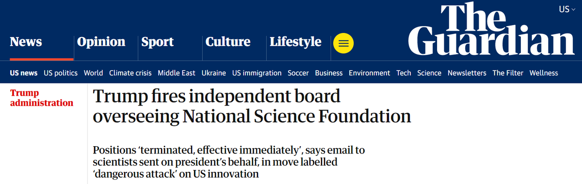 据英国《卫报》报道,美国国家科学委员会现任22名成员全部收到总统人事办公室以特朗普名义发来的电子邮件,称其职位“立即终止”。