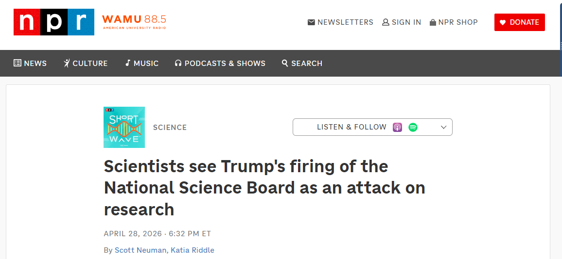 被解雇的委员会成员之一、摩根州立大学研究与经济发展副校长威利·梅深感失望:“我对本届政府对科学咨询体系的系统性拆解越来越担忧,而国家科学委员会只是最新的牺牲品。”