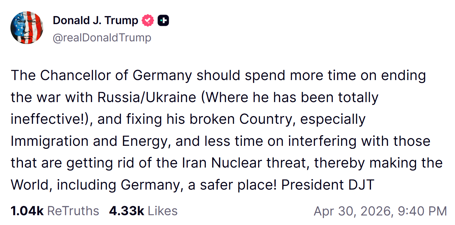 特朗普写道,“德国总理应该多花时间去结束俄乌冲突(在这方面他完全没有成效),并修复他那个支离破碎的国家,尤其是在移民和能源问题上,而不是去干涉那些正在消除伊朗核威胁的人。这样才能让世界——包括德国——变得更加安全!”