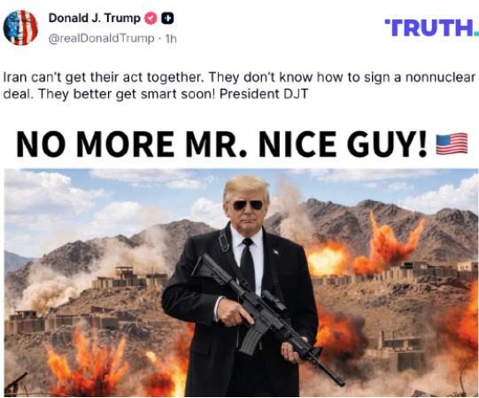 4月29日,特朗普发布了一张海报,他手持枪支面对镜头,背后则是轰炸伊朗,图片还配上了一段加粗的标语——“不再做好好先生”。
