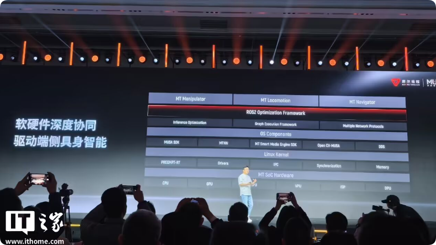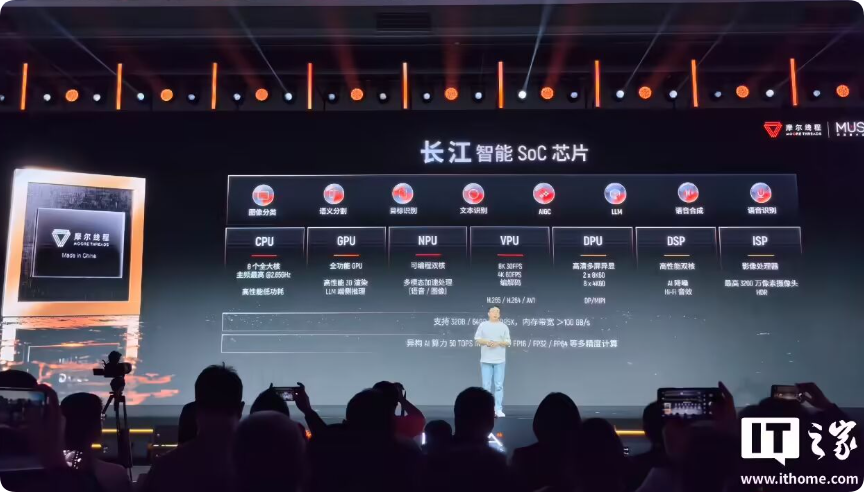 据摩尔线程创始人、董事长兼 CEO 张建中现场介绍,这款芯片采用 8 核心设计,所有核心均为大核,主频最高可达 2.65GHz,内置全功能 GPU,支持高性能 3D 渲染、LLM(IT之家注:大语言模型)端侧推理,还拥有可编程双核 NPU(神经网络引擎),支持多模态加速处理语音 / 图像。