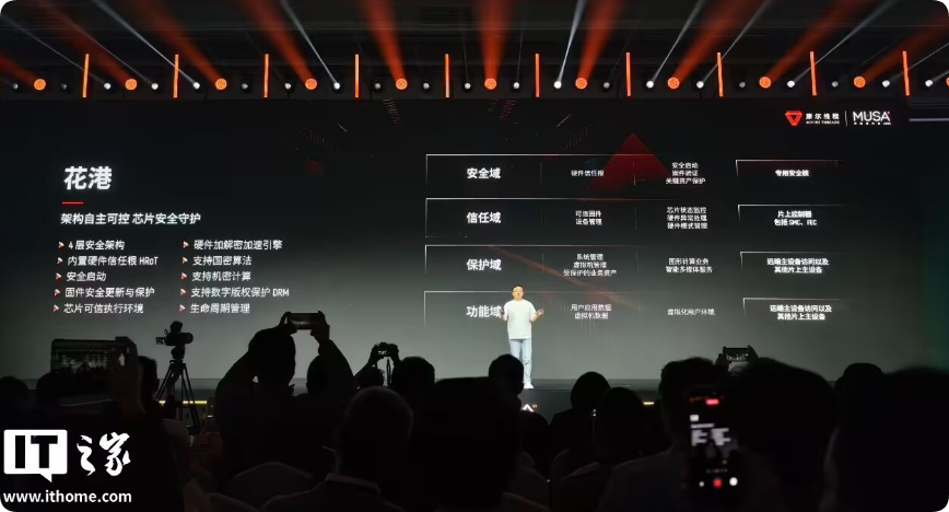 据摩尔线程官方介绍,花港配备 4 层安全架构,通过安全域、信任域、保护域、功能域四个层级,实现不同维度的安全管理与功能承载。