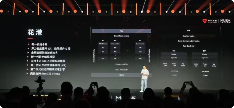 虽然不久前摩尔线程陷入了募集资金用于投资的争议,但是他们此前承诺的MUSA开发者大会还是在北京中关村召开了。在会上,摩尔线程展示了自家下一代GPU架构——“花港”,不愧是中国厂商啊,终于不用那些拗口的英文架构名了。在新架构的基础上,摩尔线程打算明年推出“华山”和“庐山”两款芯片,分别应用于 AI 推理训练一体和高性能图形渲染场景。这也算是侧面证明了摩尔线程的研发实力,不知道性能能达到PPT的程度不?