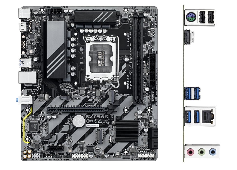 CPU套装的性价比非常高,Ultra 5-225F盒装搭配技嘉B860M-K主板的套装价格也才1379元,甚至比一大堆H810套装还要便宜很多。技嘉B860M-K采用4+1+2+1相供电设计,可以满足Ultra 5级别处理器的高负载稳定运行。扩展接口方面,该主板自带4个SATAIII、6个USB 3.0(4后+2前)以及2条全速M.2(均为4.0x4)。集成声卡为主流级的ALC897,集成网卡为入门级的RTL8111H。