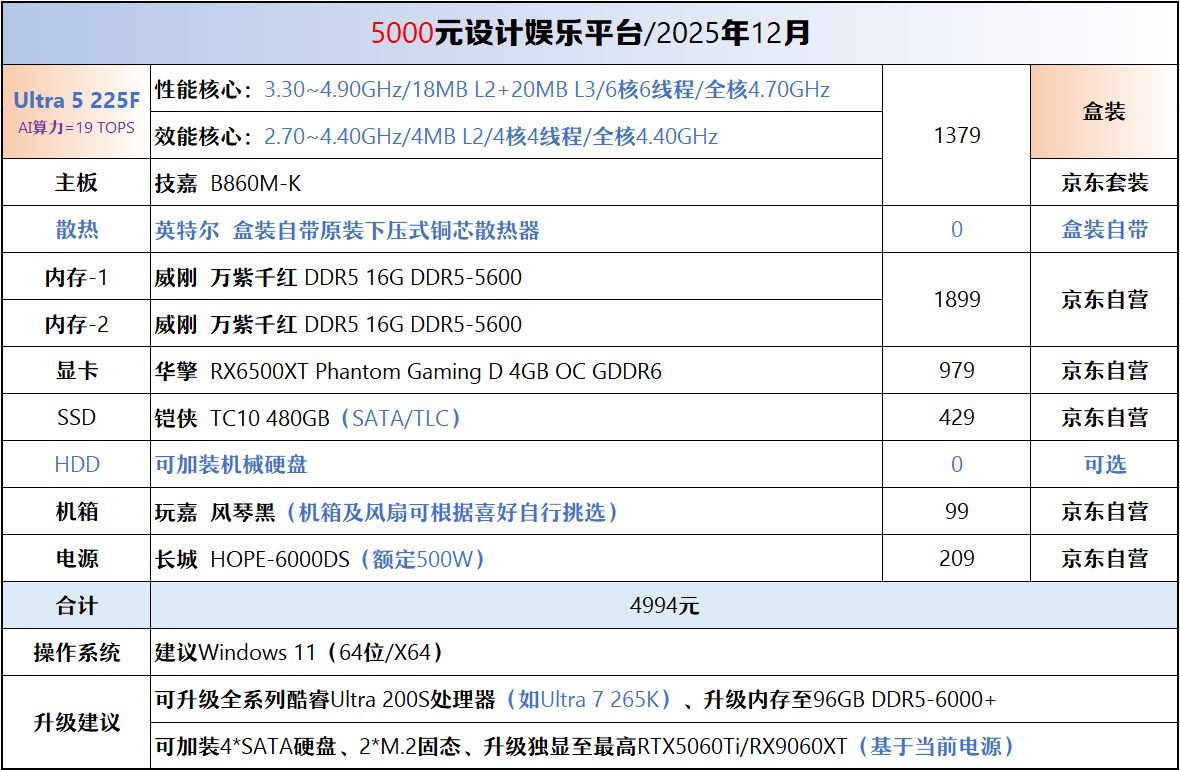 Q:您好,近期想装一台电脑,主要用于日常抖音、快手平台的短视频制作,闲暇时间也会打打大型单机游戏,预算不超过5000元。配件务必有质量保障,希望从京东自营平台购买,并且配件需要来自一线大品牌,不需要光,内存最好是32GB,存储空间尽量1TB,处理器选择英特尔这边的新产品。