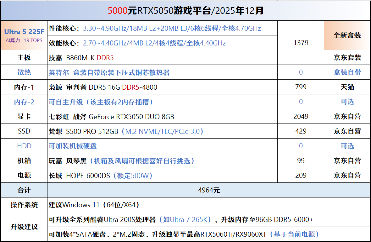 上述两个配件调整后,留给独立显卡的预算部分可以增加到2000元附近,选择RTX5050就比较充裕了,相关型号可以考虑七彩虹的RTX5050双风扇战斧,也可以选择AMD阵营8GB显存版的RX9060XT,性能更好但大概率会超预算。