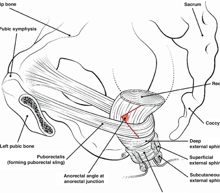 在非排便状态下,耻骨直肠肌保持强直性收缩,将直肠向前拉,在直肠与肛管的连接处形成一个约为 90 度至 100 度的急角。