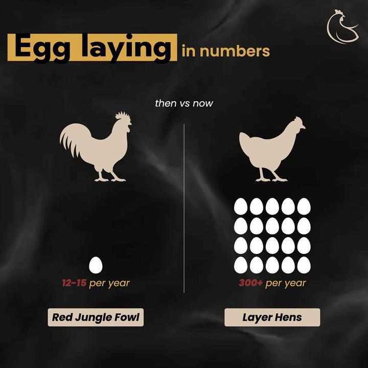 家鸡的野生祖先叫做红色原鸡(Gallus gallus),这种生活在丛林里的鸟类,每年只会产下 10 到 15 枚鸡蛋,而且只在繁殖季节产蛋 。