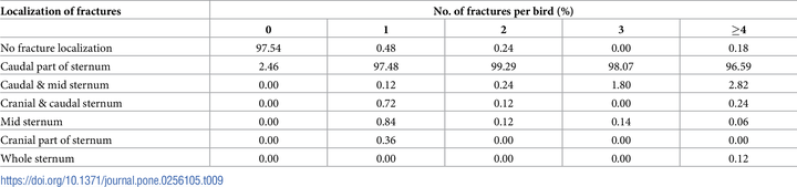 下表中列出了骨折发生的位置,可见骨折绝大多数发生在胸骨的“尾部尖端”(Caudal part)