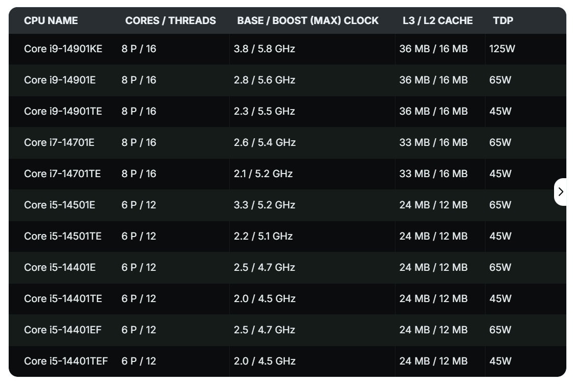事实上英特尔早就推出来了,只不过划归到了仅面向嵌入式领域的E系列家族。像i5系列就仅仅只保留6个P核,为6核12线程;i7系列仅保留8个P核,为8核16线程;i9系列也是仅保留8个P核,只是频率上会比i7系列稍微高一丢丢,并且上述三个系列的三级缓存也是完整保留,没有相应精简。