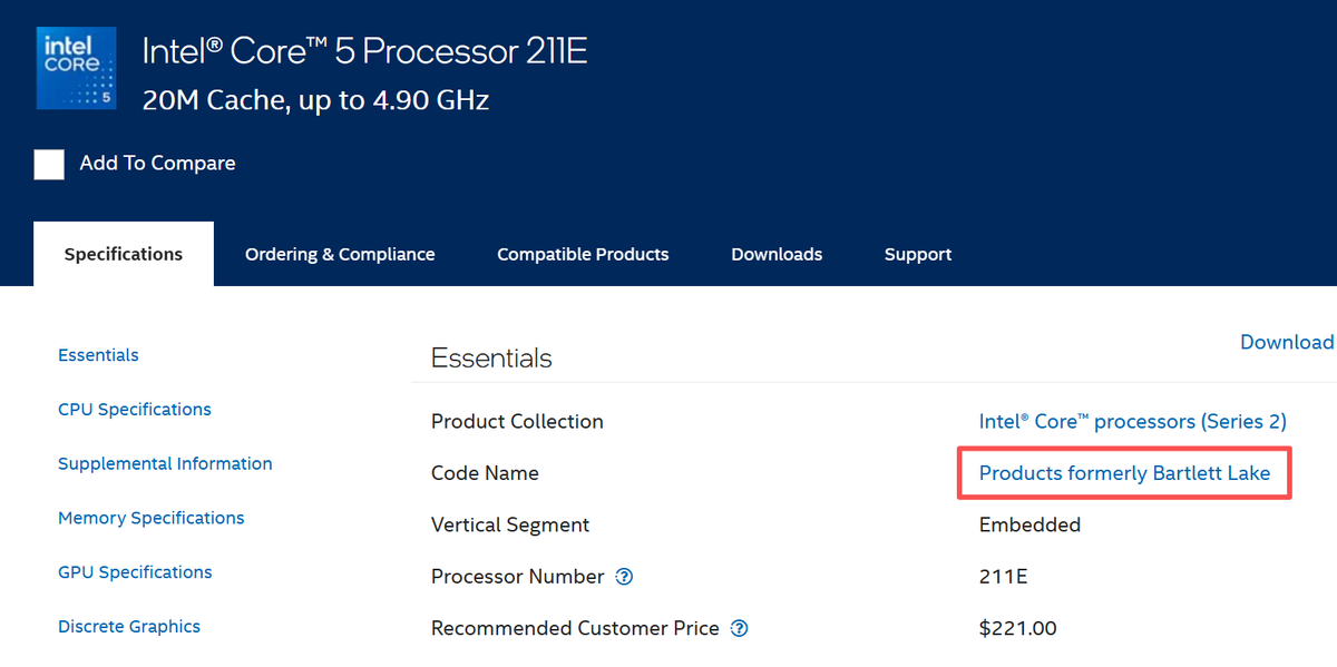 而Bartlett Lake架构就是Raptor Lake,属于纯更名马甲架构,不带任何特性的变更,甚至最离谱的是它和Raptor Lake架构一样,也是Alder Lake+Raptor Lake混着用。比如Core 5-211E,产品页面上写着Bartlett Lake,但你看它的D5内存兼容频率4800MHz以及每P核1.25MB L2、每4个E核共享2MB L2,这不就是同为英特尔官网标注Raptor Lake实为12代Alder Lake架构的i5-13400、14400的更名产品么。
