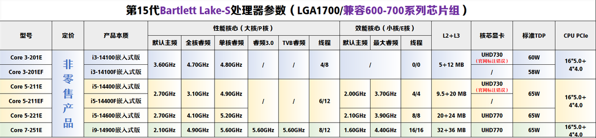 之前还有新闻说,英特尔要推出新的Bartlett Lake架构用于延续第14代酷睿i处理器,并推出具备12个P核的纯12核处理器。就目前来看,纯12个P核的CPU没等到,但Bartlett Lake架构却很早就到位了,并且应用在“零售废弃”的Core家族。