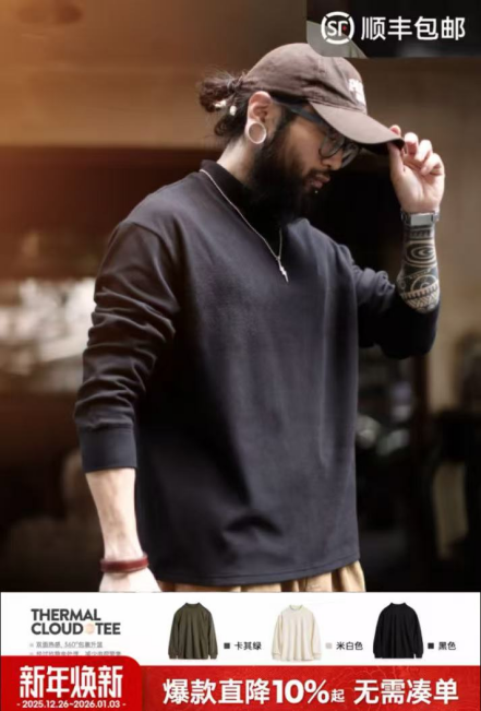 马登工装 休闲半高领长袖打底衫,67.9元,双面热感绒长T,升级抗静电功能和5A抗菌,磨毛材质贴肤穿保暖性很好,黑、白、卡其绿三色,百搭不挑身材。