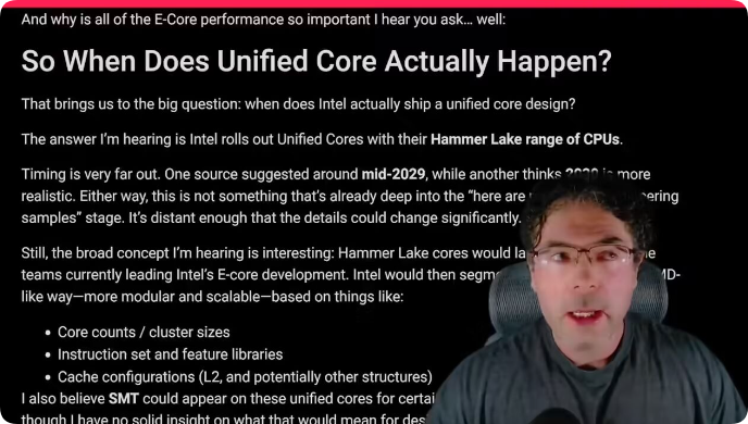 消息源透露英特尔正在规划一项激进的架构转型,在代号为 Hammer Lake 的处理器中,英特尔计划放弃目前使用的异构混合架构(即独立的 P 核与 E 核),转而采用全新的“统一核心”(Unified Core)设计(可能在 2029 年年中或之后推出)。