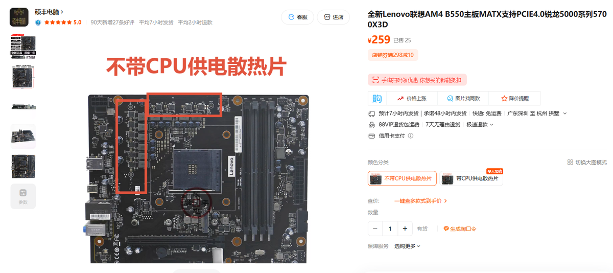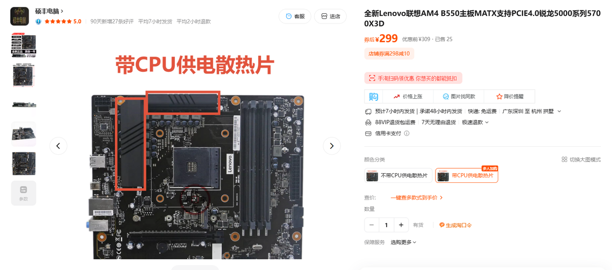 “丐版”如上图所示,取消了供电MOS部分的散热片,一般是搭配R5、R7级别处理器使用,也有卖家销售这一款,全新的只要259元(降低了40元)。取消了MOS散热片之后,CPU供电的能力上限会降低20%-30%(具体看机箱内部的温度情况),但即便如此,这套供电系统仍然可以稳定输出大概150W左右的能量。