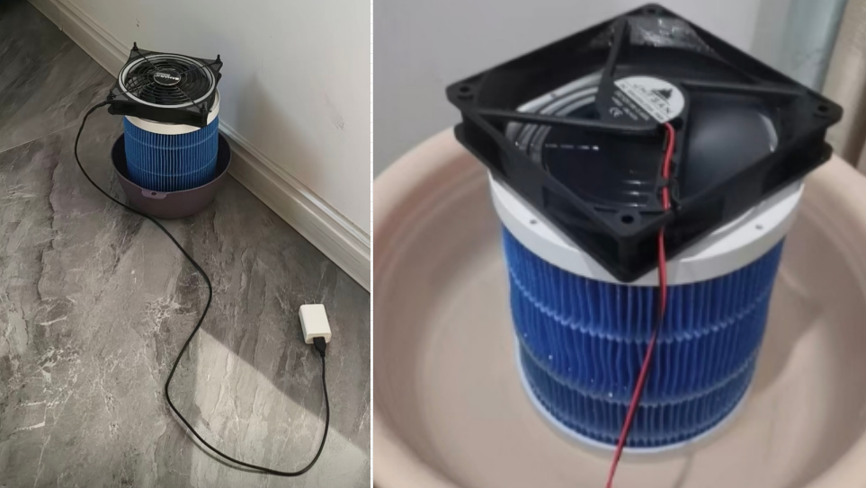 最后,其实也有更廉价的替代版本,比如往窗帘上喷水,用毛巾一头搭在水盆一头搭在小太阳/暖气片等方法。或者自己买【加湿器滤网14元】+【机箱风扇】+【改装个供电】+【洗脸盆】组装一个简陋版本的加湿器: