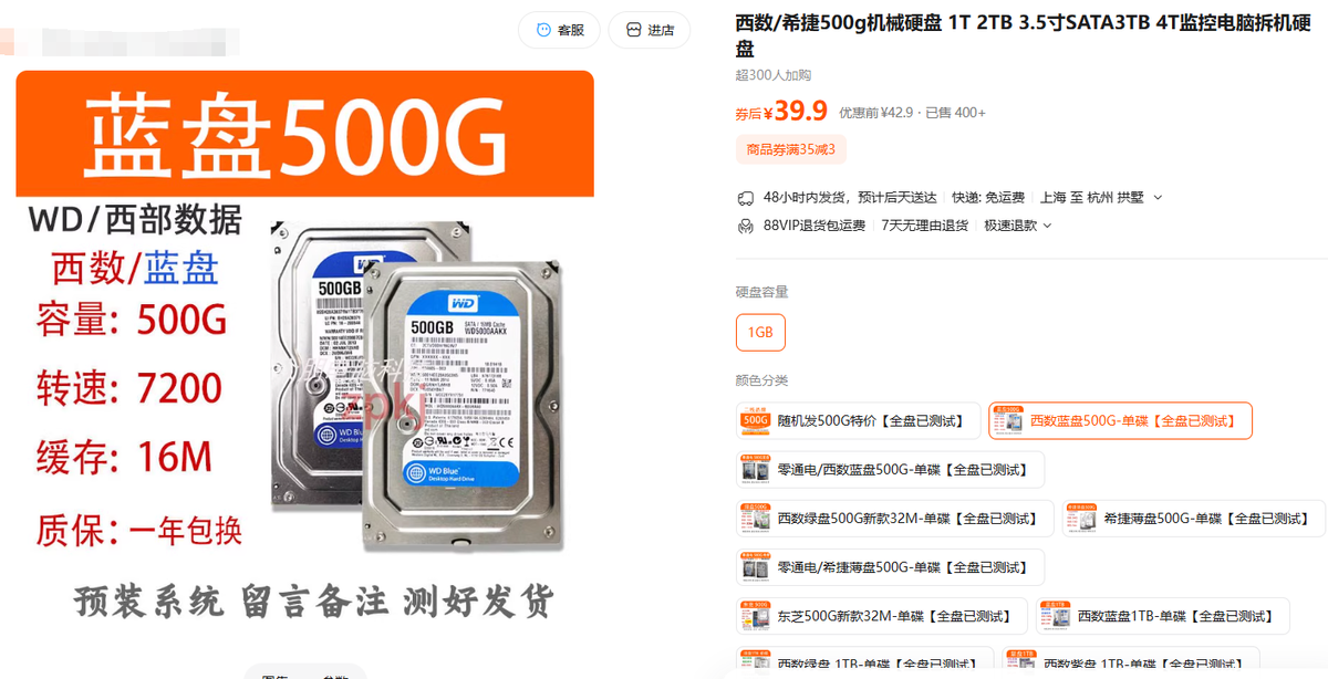 500GB及以上容量属于热门产品,价格相对较高,其中500GB拆机机械盘的价格一般在35元-60元区间,平均1GB价格约为0.8-1毛钱,1TB及以上容量产品的单GB价格平摊后可能在1毛5或2毛。低于500GB容量型号属于“非主流产品”,除了320GB可能还有少量商家在卖之外,像250GB、160GB都属于是停产15年以上的高龄古董,选购价值不大,低预算买二手机械硬盘优先选择500GB、1TB的款式。