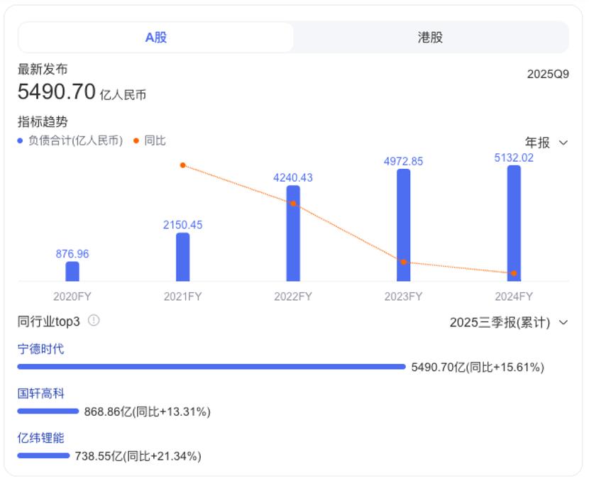 最近5年,宁德时代的负债额在急剧升高。2020年负债为874.24亿,第二年就涨到了2150.45亿。2024年,宁德时代负债首次超过5000亿,达到5132亿。今年前三季度,进一步升高至5490.7亿,预计全年大概率会超过6000亿。