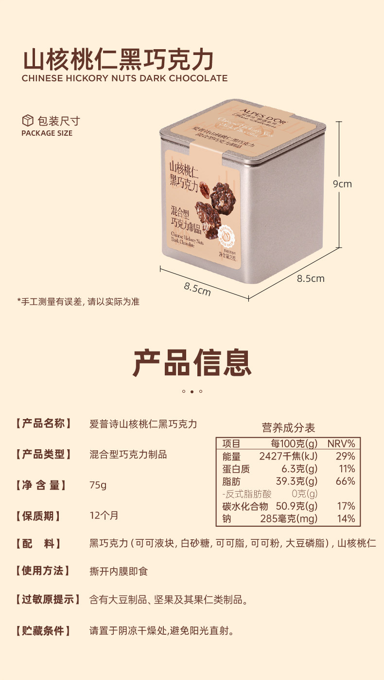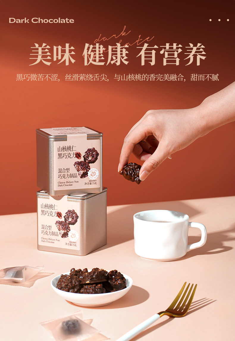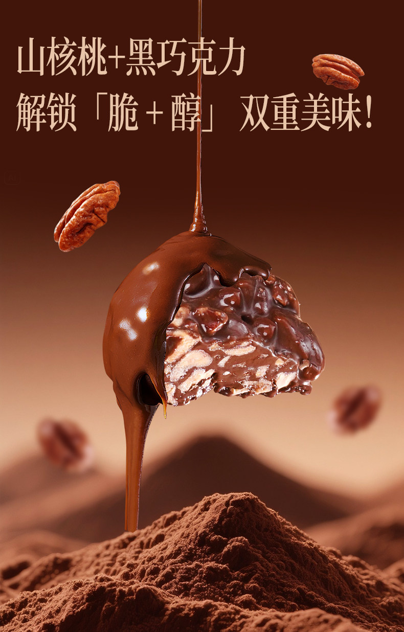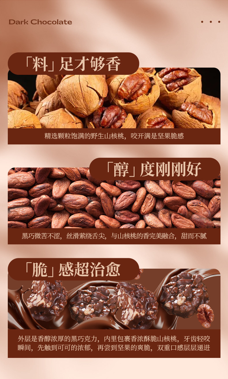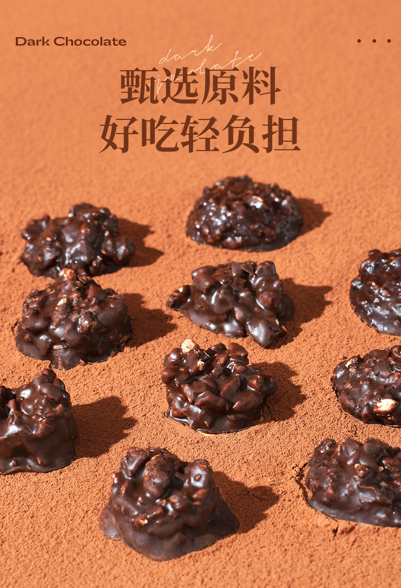 黑巧微苦不涩,丝滑萦绕舌尖,完美融合坚果香气,口感甜而不腻。