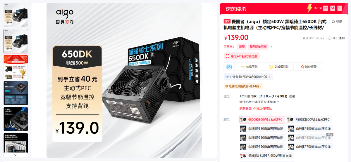 电源搭配500W足够,但配置单为了将预算压缩到5000元附近,选择了非常入门的爱国者650DK。这款电源采用单路12V供电设计,12V功率可以达到456W,供电能力没有任何问题,无非综合品质比较一般。