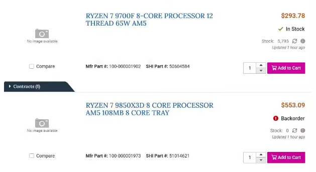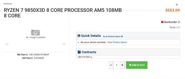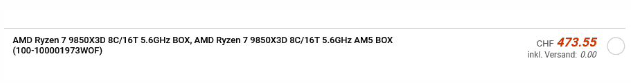 根据目前披露的信息,R7 9850X3D 已在美国企业级经销商 SHI 上架,标价约 553 美元(现汇率约合 3898 元人民币)。与此同时,一家瑞士零售商也列出了该处理器,价格为 473.55 瑞士法郎,折合约 549 美元(现汇率约合 3870 元人民币)。