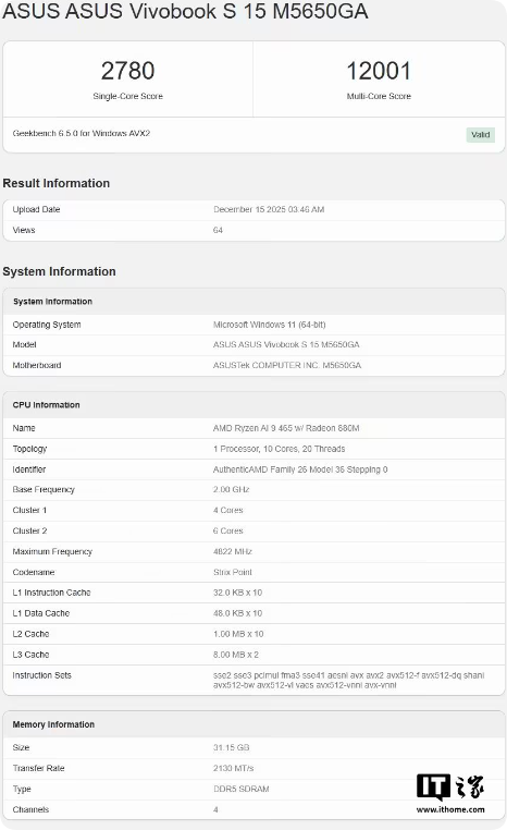 昨日,一款搭载 AMD 锐龙 AI 9 465 处理器的华硕 Vivobook S 15(M5650GA)出现在了 Geekbench 数据库中,其 CPU 性能与前代 AI 9 365 基本处于同一水平。