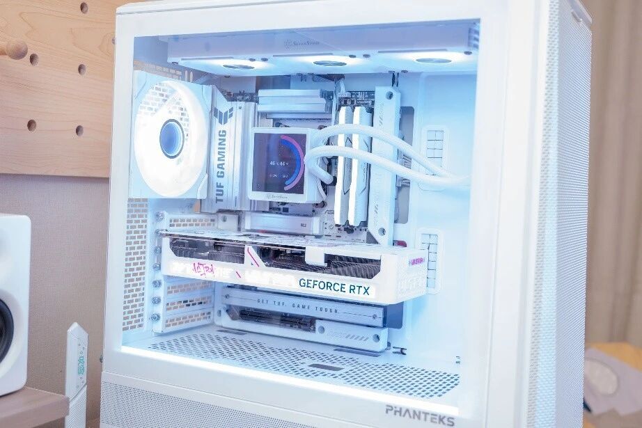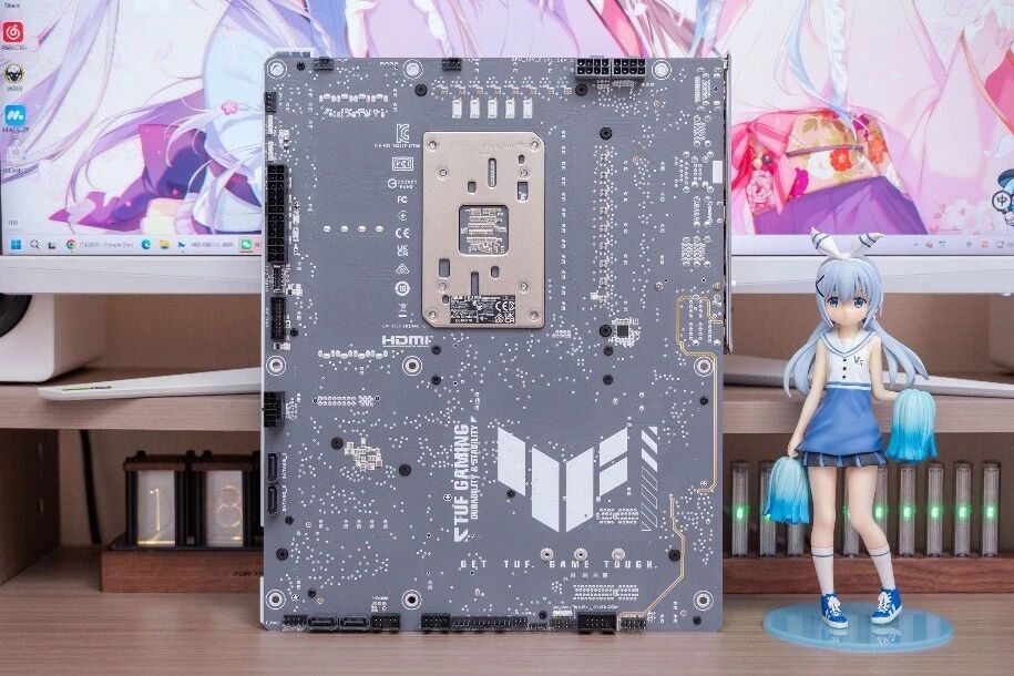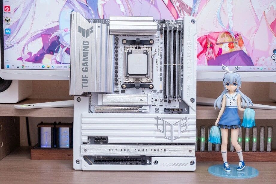 主板选择了华硕的TUF B850 BTF WIFI W,因为显卡是白色的,所以主板选个黑色的很别扭。这张是目前唯一支持背插显卡供电的白色主板,并且定位也不算低端,搭配98X3D和5070ti很合适。