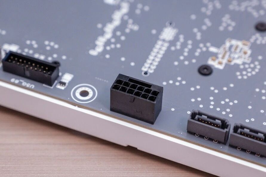 由于采用了背插供电设计,16PIN用白色的塞子塞住了,看上整体性更强一些。当然,如果你没有支持背插供电的主板的话,拿掉这个塞子接16PIN也是能用的。