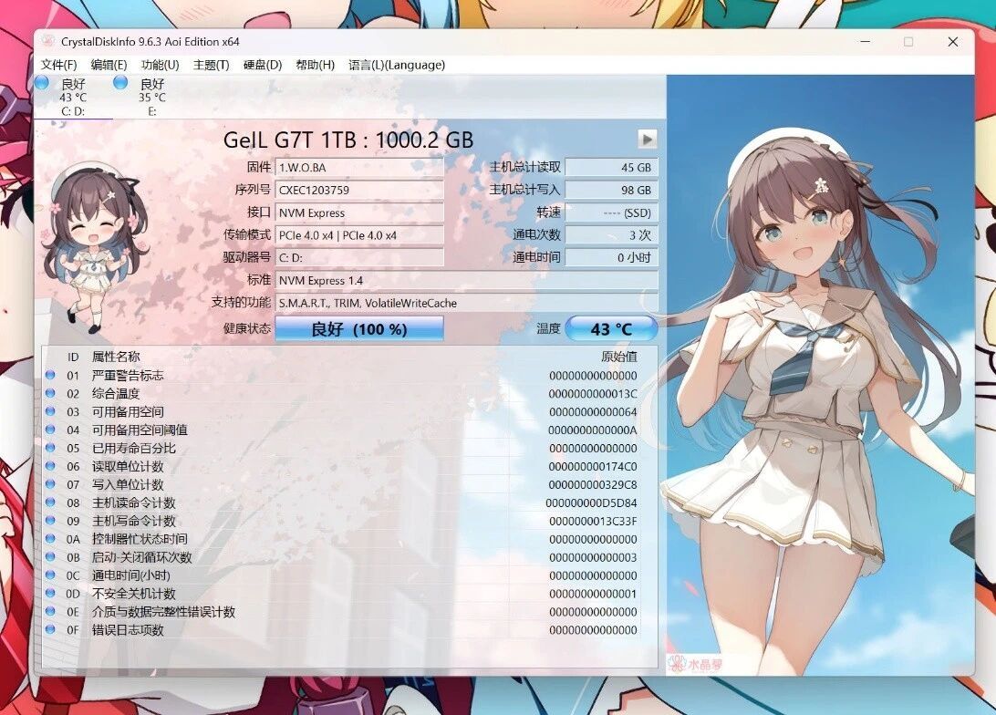 SSD信息如下,4.0x4规格,支持nvme1.4规范,并且温度不是很高,显卡上面也只有43℃的待机温度,毕竟是无缓方案,发热不高。