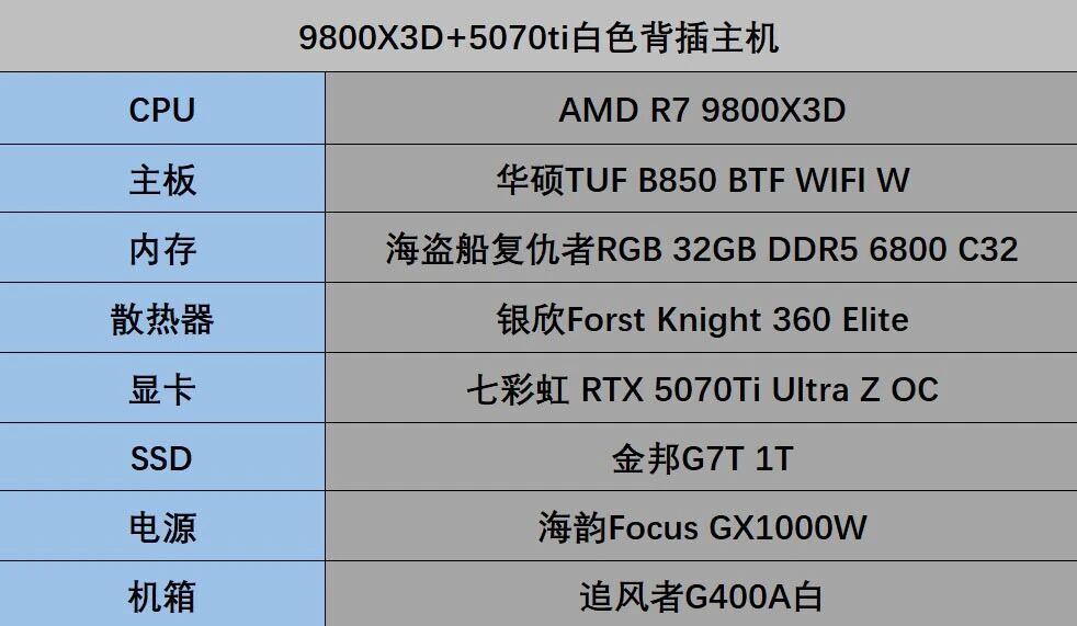 机器配置如下,CPU是我自己机器上拆下来的9800X3D,搭配华硕的TUF B850 BTF WIFI W主板,这也是目前唯一一张白色且支持背插显卡供电的主板。内存本来我想用48GB的,但是看看现在内存的价格,上个32GB吧。机箱是我买到的目前最便宜的支持背插的白色机箱,并且颜值还ok。总的来说,即便不看背插,98X3D+5070ti这个黄金搭配也是OK的。