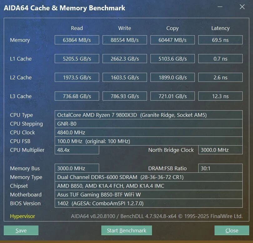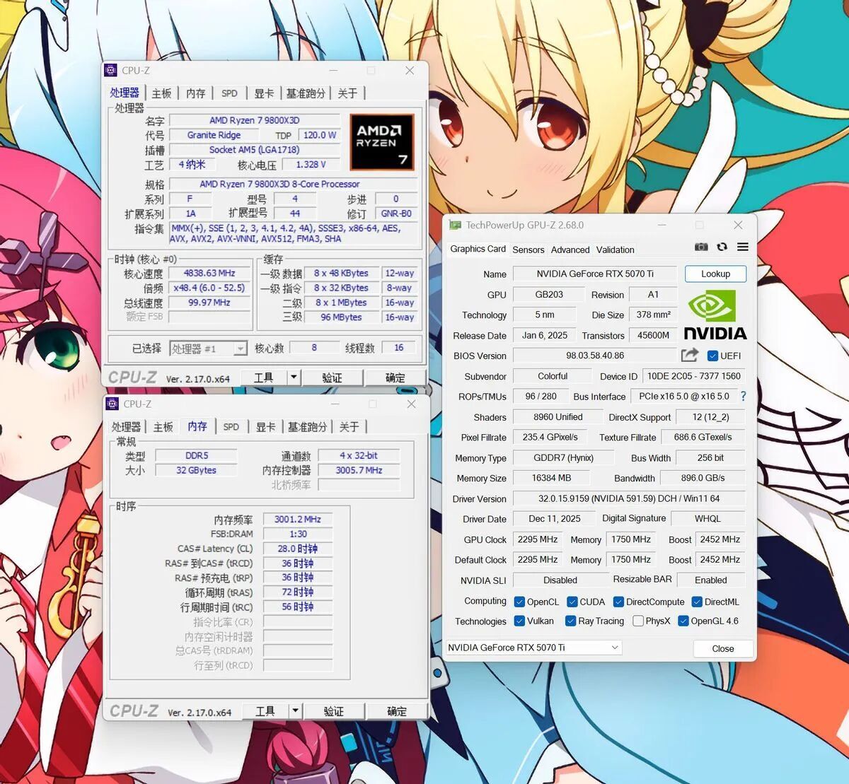 然后照例简单对机器做一下测试。机器的内存我照例设置为了6000C28的时序,也就是图中的28-36-36-72。毕竟海盗船这套是海力士的mdie,超频还是没问题的。98X3D和5070ti的规格大家都很熟悉了,这里就不再过多介绍。