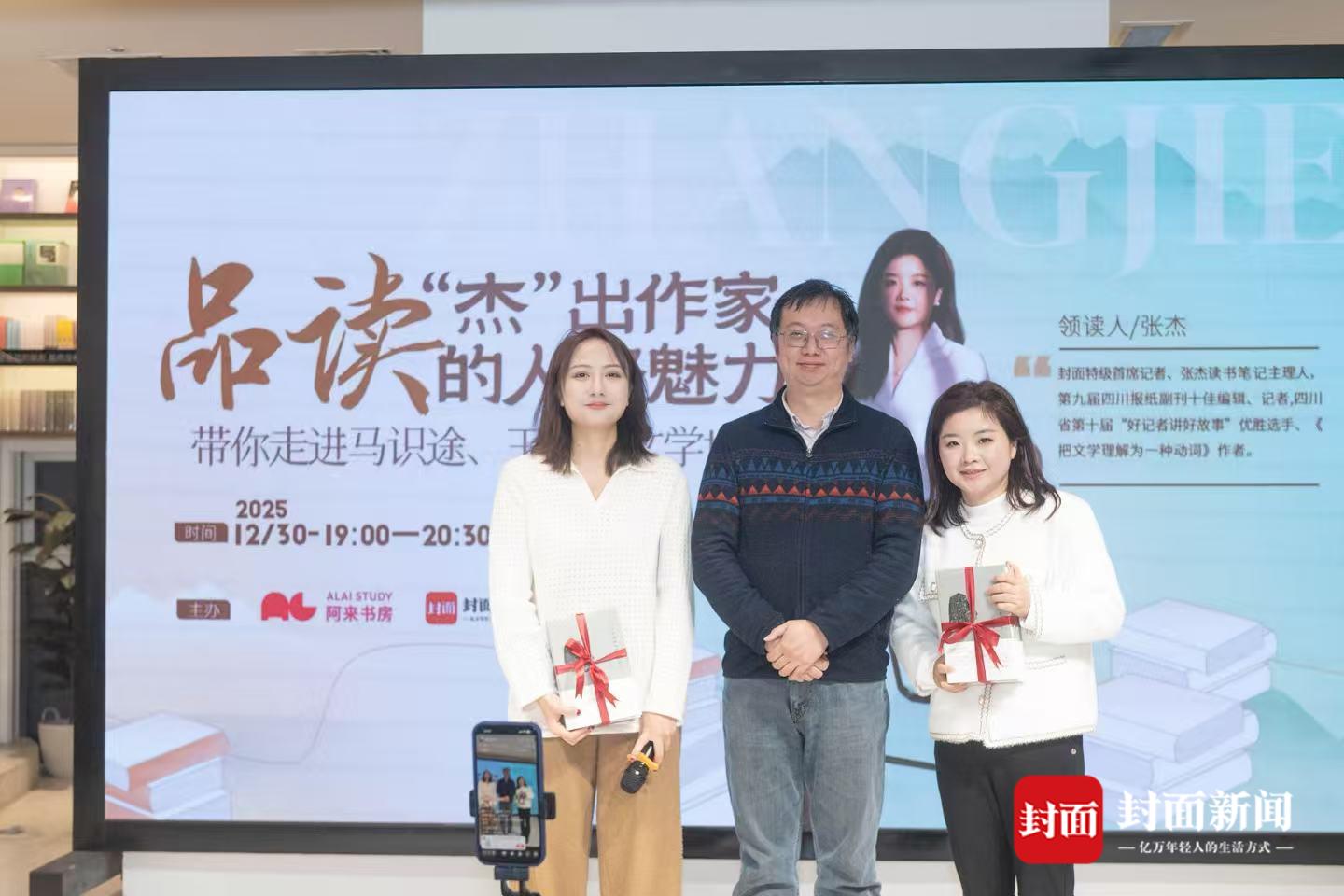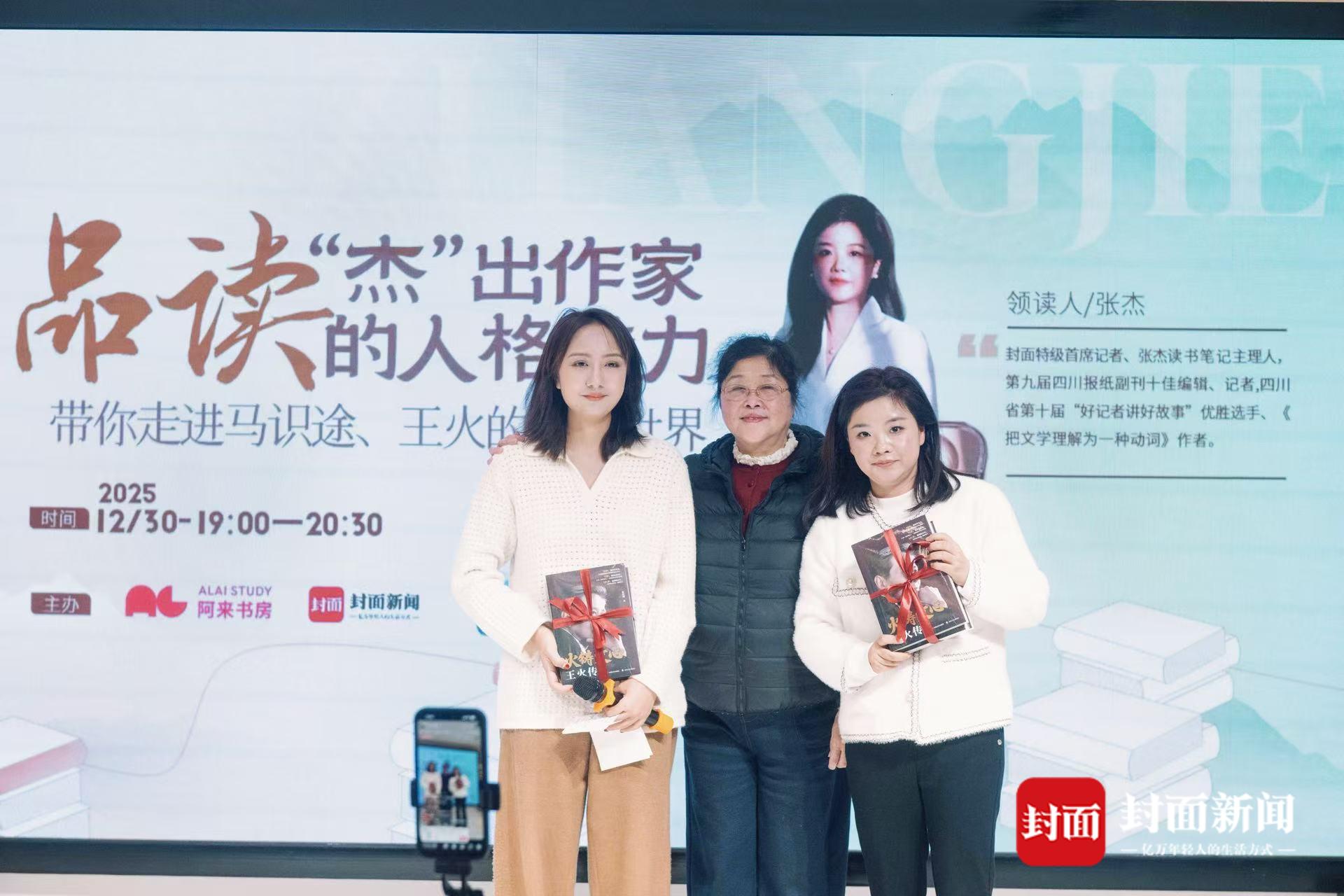 岁末寒夜,雨丝纷飞,阿来书房的灯火却格外温润明亮。2025年12月30日晚,一场以“品读‘杰’出作家的人格魅力:带你走进马识途、王火的文学世界”为主题的阿来书房读书会在此举行。2024年与2025年,中国文坛接连送别两位与世纪同行的大家——110岁的马识途与103岁的王火。他们虽已远行,却将丰厚的著作与悠长的精神回响留在了人间。当晚,读者、编辑、记者与作家亲友齐聚一堂,围炉共话,以文学重逢,以讲述怀念,完成了一次跨越时空的温暖致敬。封面新闻客户端与“张杰读书笔记”视频号的直播,更将这份温暖传递给了超过50万名线上观众。