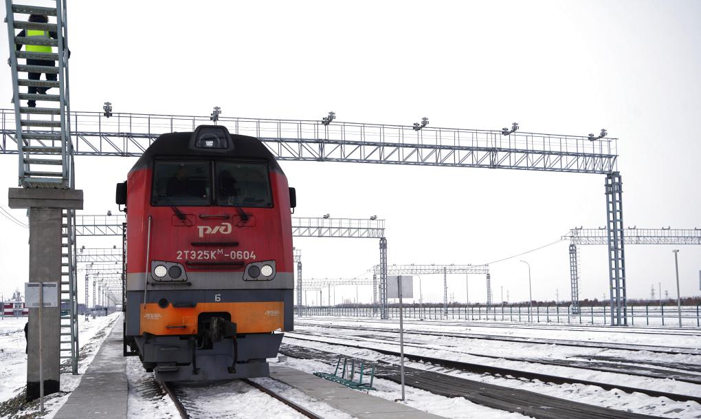 2025年12月6日,一辆即将开往中国的俄罗斯货运列车停靠在俄罗斯下列宁斯阔耶铁路口岸。新华社记者刘恺摄