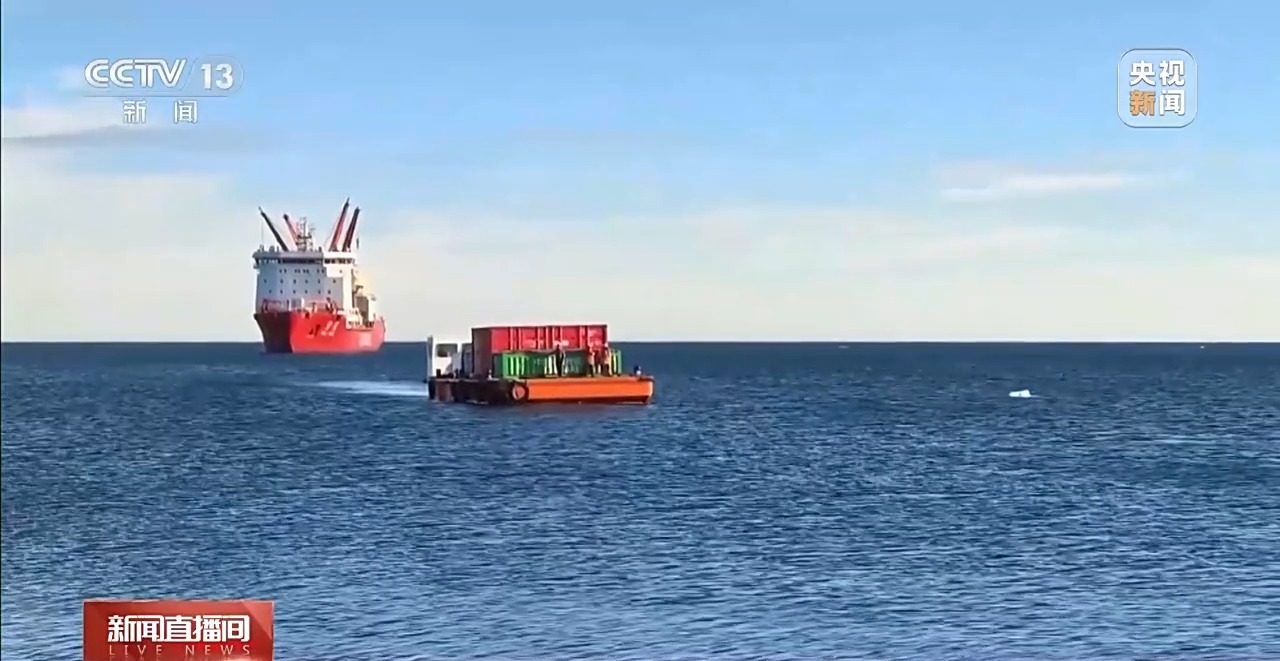 在抵达秦岭站后,“雪龙”号立即安排直升机出库作业,为人员上站做好准备。同时,“雪龙”号与“长江驳”配合,进行水上卸货作业。