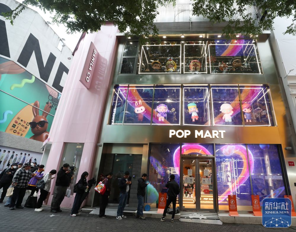 ↑2025年5月20日,消费者在韩国首尔明洞街区的泡泡玛特店面前排队。