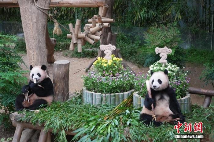 2025年7月7日,在韩国诞生的雌性大熊猫双胞胎“睿宝”和“辉宝”迎来两周岁生日。位于韩国龙仁的爱宝乐园为它们举办庆生活动。图为大熊猫“睿宝”(左)和“辉宝”在生日会上。