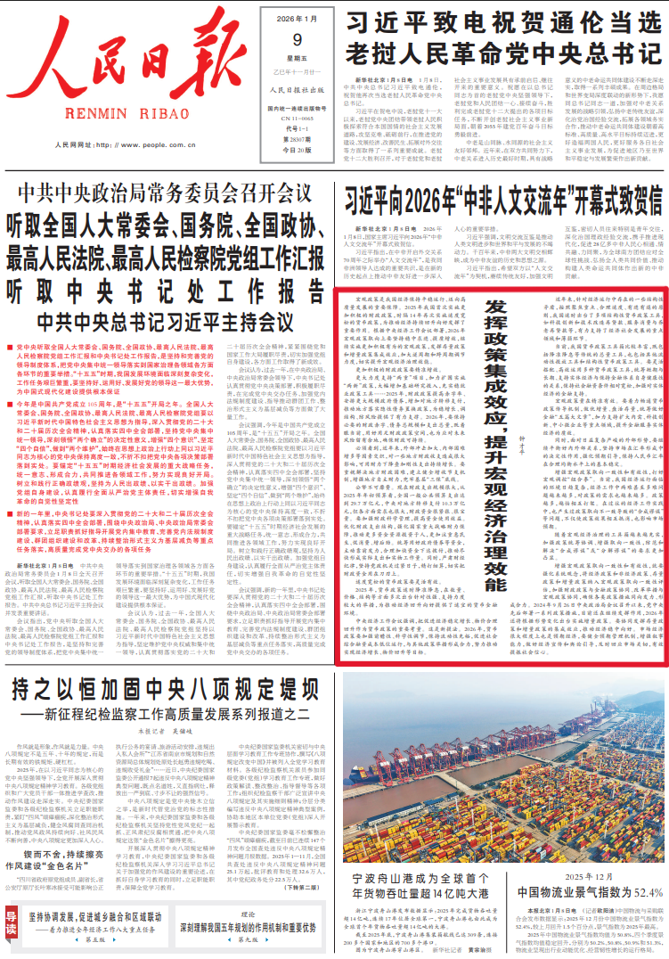 1月9日刊发的“钟才平”文章《发挥政策集成效应,提升宏观经济治理效能》开篇指出,宏观政策是我国经济保持平稳运行、迈向高质量发展的重要保障。2025年我国首次实施更加积极的财政政策,时隔14年再次实施适度宽松的货币政策,为推动经济持续回升向好发挥了重要作用。根据中央经济工作会议部署,2026年宏观政策取向上要坚持稳中求进、提质增效,继续实施更加积极有为的宏观政策,发挥存量政策和增量政策集成效应,加大逆周期和跨周期调节力度,切实提升宏观经济治理效能。