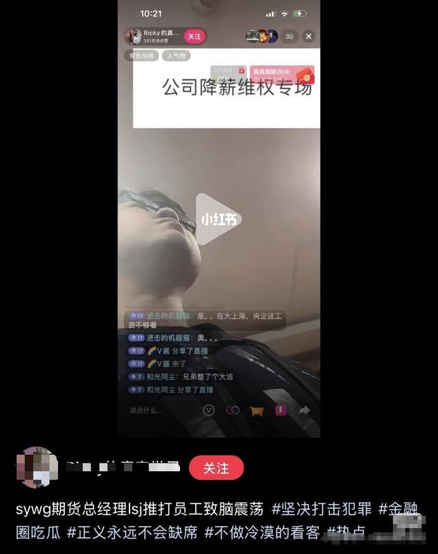 一网友(疑似申银万国期货员工)以“维权”名义开启直播,向公司领导讨要说法。直播画面中,领导对维权员工实施肢体攻击。据网友文案描述,该领导殴打行为导致员工出现脑震荡症状。