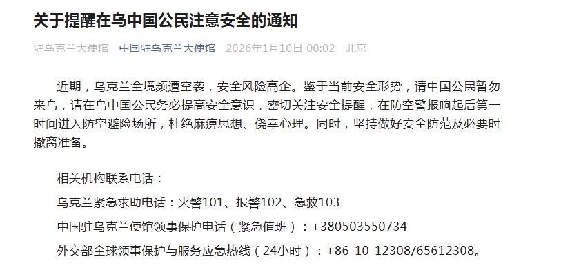 近期,乌克兰全境频遭空袭,安全风险高企。鉴于当前安全形势,请中国公民暂勿来乌,请在乌中国公民务必提高安全意识,密切关注安全提醒,在防空警报响起后第一时间进入防空避险场所,杜绝麻痹思想、侥幸心理。同时,坚持做好安全防范及必要时撤离准备。 相关机构联系电话: 乌克兰紧急求助电话:火警101、报警102、急救103中国驻乌克兰使馆领事保护电话(紧急值班):+380503550734外交部全球领事保护与服务应急热线(24小时):+86-10-12308/65612308。