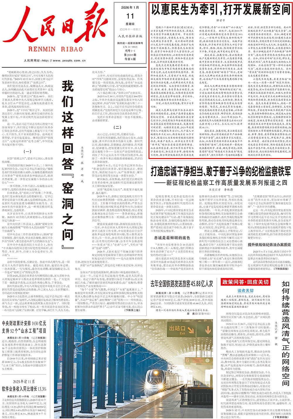 1月11日,《人民日报》头版重要位置刊发第五篇署名“钟才平”的文章,题目为《以惠民生为牵引,打开发展新空间》。