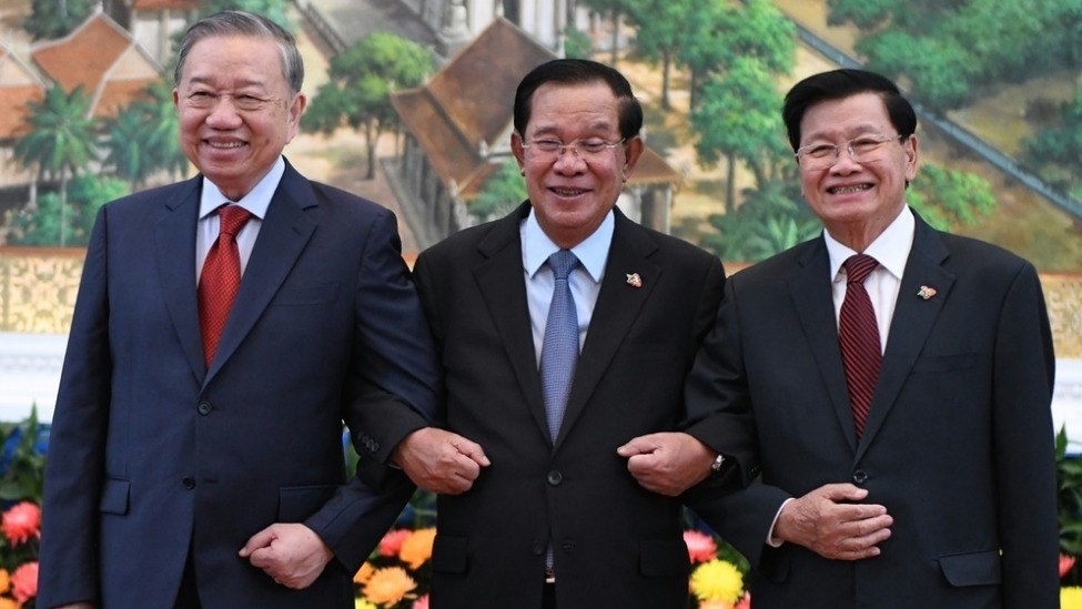 柬埔寨人民党主席洪森、越共中央总书记苏林,以及老挝人民革命党中央总书记通伦手挽手同框